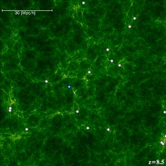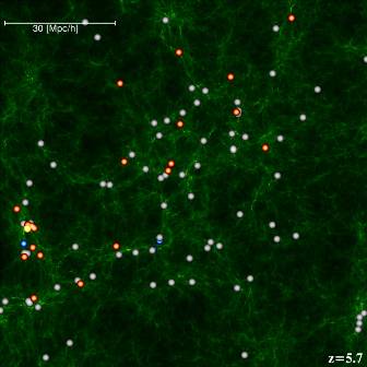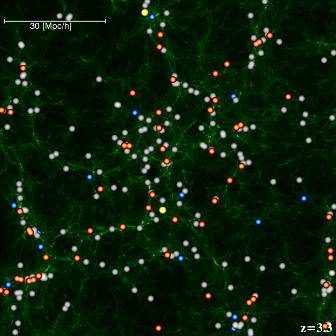 bang. Their hypothesis is that galaxies began to form out of the debris of massive stars which died explosively shortly after the beginning of the Universe. The Durham calculation predicts where these galaxies would appear and how they could have evolved to the present day, over 13 billion years later. The researchers hope their findings, which highlight star forming galaxies, will improve their understanding of dark matter — a mysterious substance which most astronomers postulate makes up 80% of the mass in the Universe, and is needed to account for current hypotheses of the creation of the universe, but which no one has yet discovered direct evidence for. The gravity produced by dark matter is an essential ingredient in galaxy formation and by studying its effects the scientists eventually hope to learn more about what the substance is. The research is published in the Monthly Notices of the Royal Astronomical Society [1] and was funded by the Science and Technology Facilities Council (STFC) and the European Commission. The work combined a massive simulation showing how structures grow in dark matter with a model showing how normal matter, such as gas, behaves to predict how galaxies grow. Gas feels the pull of gravity from dark matter and is heated up before cooling by releasing radiation and turning into stars. The simulation images show which galaxies are forming stars most vigorously at a given time. Although the galaxies are biggest at the present day, the rate at which they are making new stars has dropped greatly compared with the rate in the early Universe. The calculations of the Durham team, supported by scientists at the Universidad Catolica in Santiago, Chile, can be tested against new observations reaching back to early stages in the history of the Universe almost one billion years after the Big Bang. Lead author, Alvaro Orsi, a research postgraduate in Durham University’s Institute for Computational Cosmology (ICC), said: “We are effectively looking back in time and by doing so we hope to learn how galaxies like our own were made and to understand more about dark matter. “The presence of dark matter is the key to building galaxies –